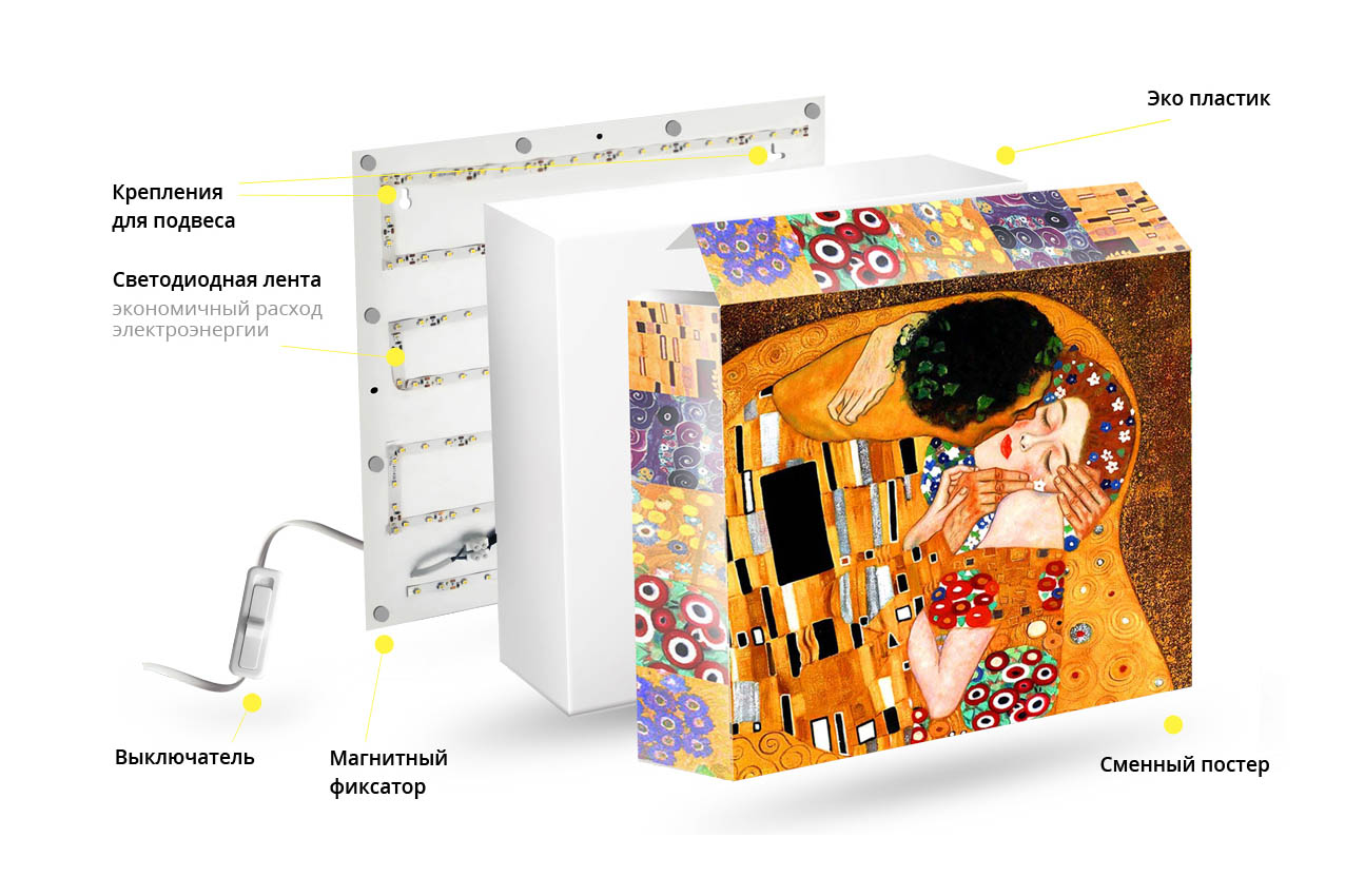 Представляет собой легкий светодиодный короб, поверх которого крепится постер с различными изображениями.